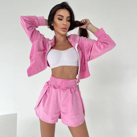 Sports two-piece zip-up hooded long-sleeved jacket Spice Girl high-waisted pleated shorts