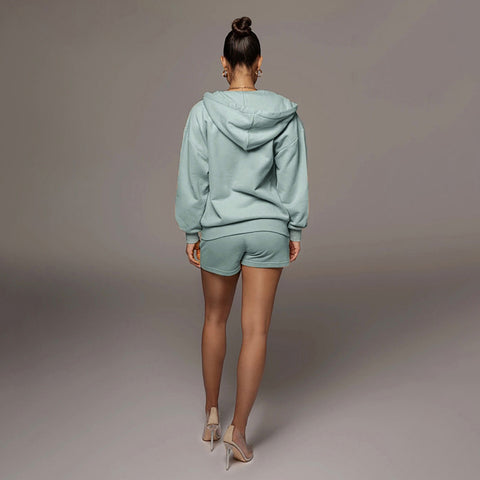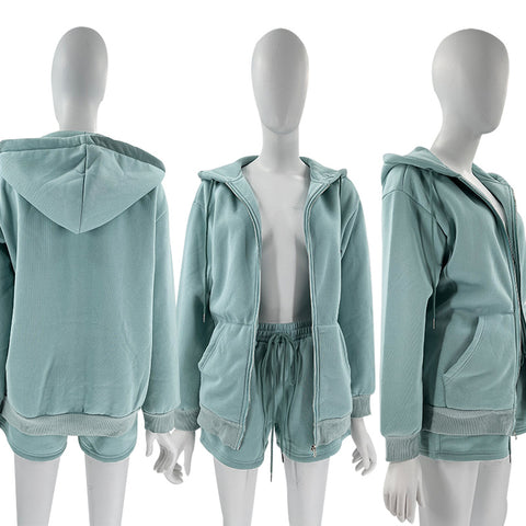 Solid color Cardigan Hooded shorts women's velvety long sleeve hoodie 2 sets of 6 colors